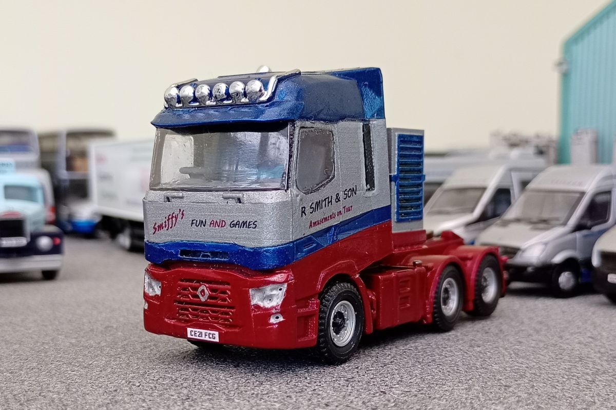 I've been experimenting with some of my random Graff City paints. This Renault T High is done entirely in French colours: Peugeot Silver, Citroen Wicked Red and Renault Extreme Blue, and yes masking the cab was a fiddle. Handily I've discovered the latter is a near-perfect match for Humbrol Baltic Blue 52, the shade I use for the coach fleet.