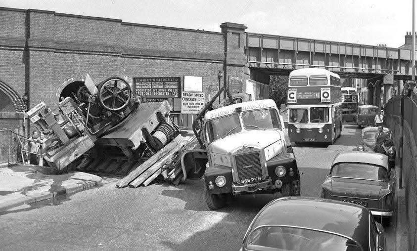 Busy part of Rochester high street with the Victoria - Ramsgate line over the bridge. Bet it caused some chaos. Early 60s?