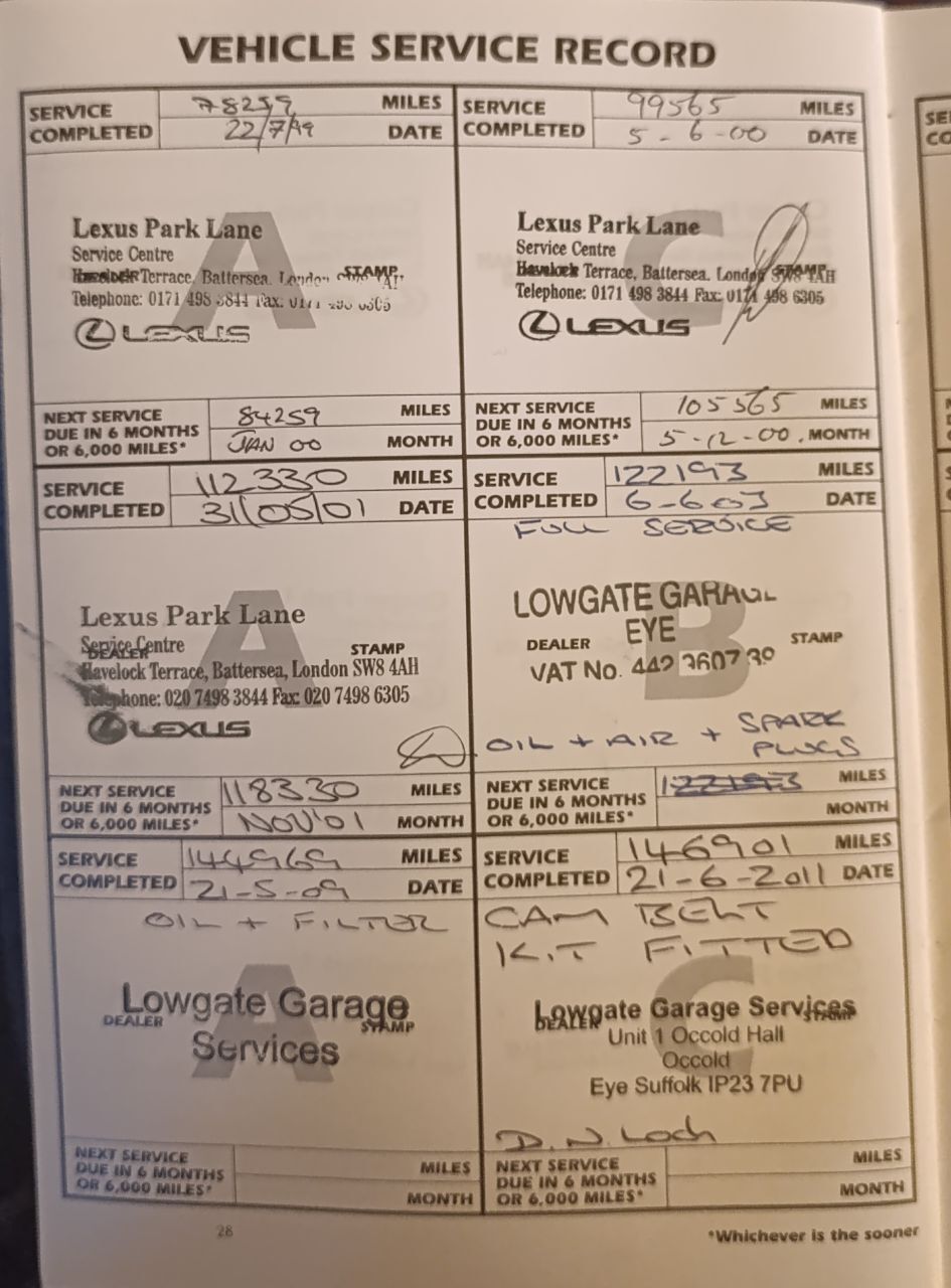Wibble Posted October 25 Posted October 25 1 hour ago, Schaefft said: Had a closer look at the dealer sticker, unfortunately unreadable: The bookpack realvealed a few more interesting details, excuse the obscured name and address: Having been delivered only a couple of days after first registration the dealership might have not registered it in their name first after all? Also "Riviera White" and Cotswold" leather seem to be UK market specific names for the Lexus color options, possibly to broaden the appeal for the British customer. Interesting leaflet about how to save fuel in your 4.0l V8 fullsize saloon. And the last service records, the final 3 probably with the next owner at that point. The owner numbers still don't stack up though as I'd be number 5, not 7. Possibly Lexus at the beginning and a dealer in-between. That or a change of address that was counted as new owner (happened to me before). When we moved and I did the change of address section of the V5 for the Senator, it came back as a new keeper. Pisses me off still, so that could well be the case. Schaefft 1