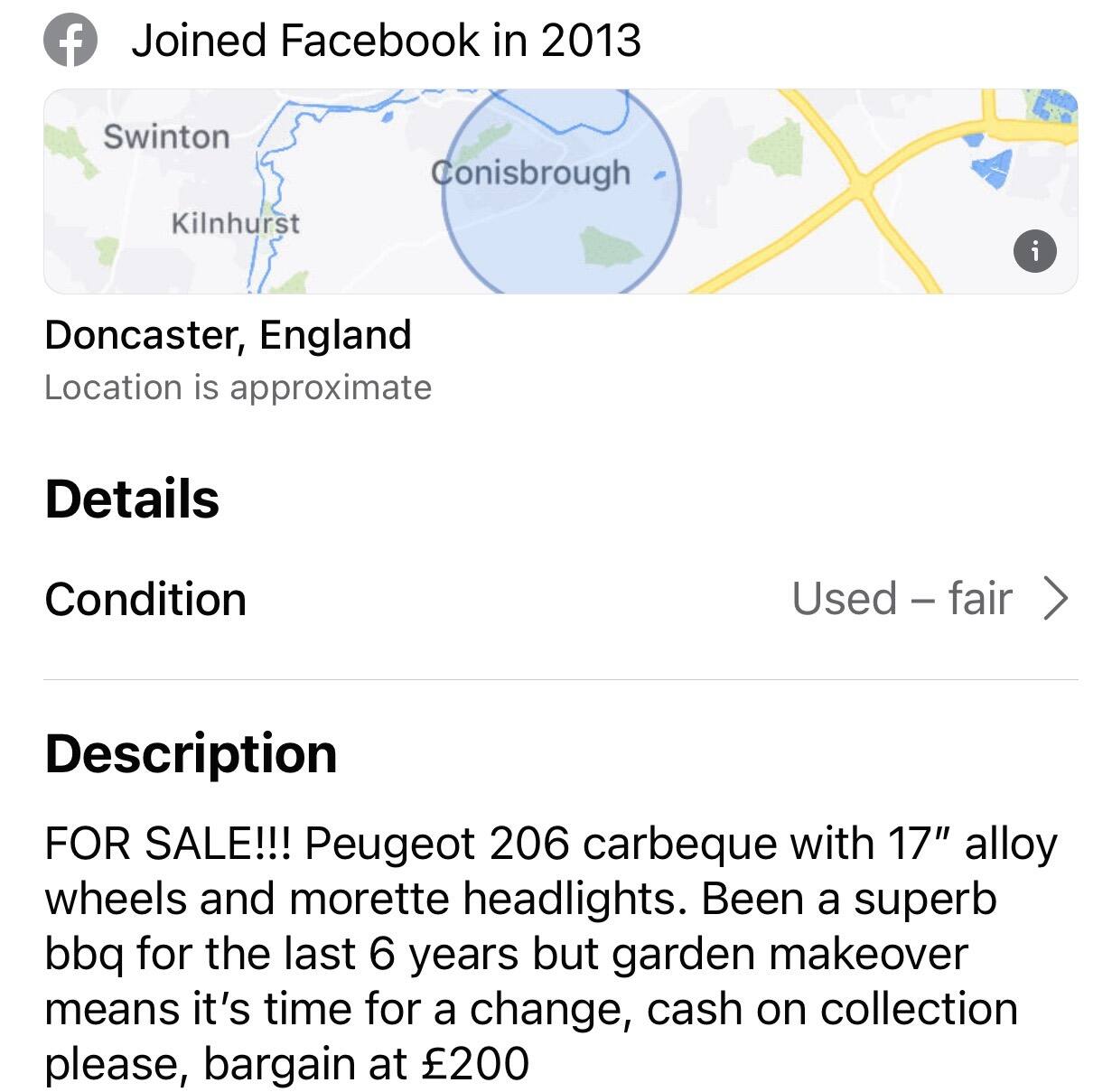 Enter the Peugeot 206 Carbeque! A snip at just £200. I can’t help thinking it would be more realistic if they’d chopped up a Mk2 Zafira 🔥