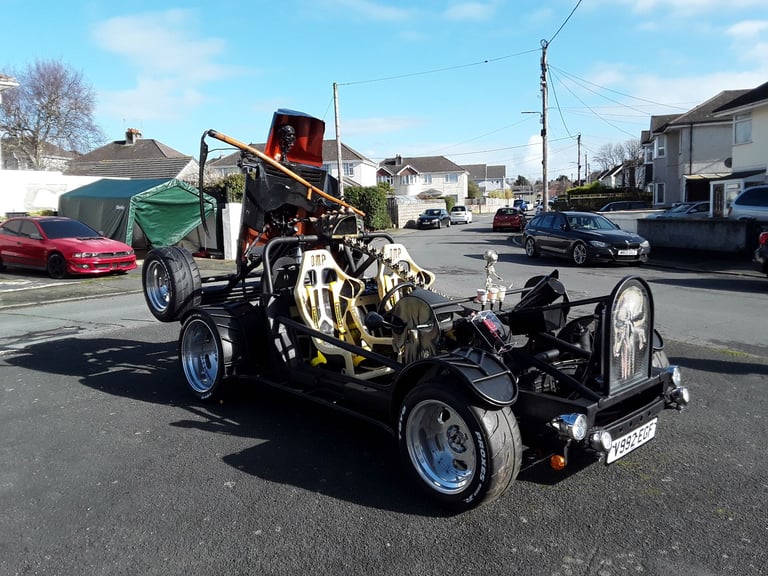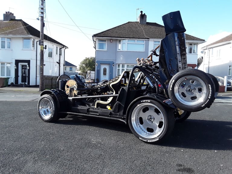 It's like a 1:1 version of a mad Tamiya kit 'Wheelie Goth Car' or summat.