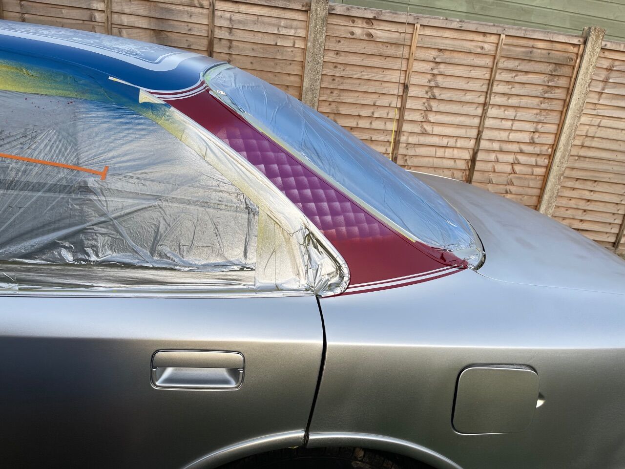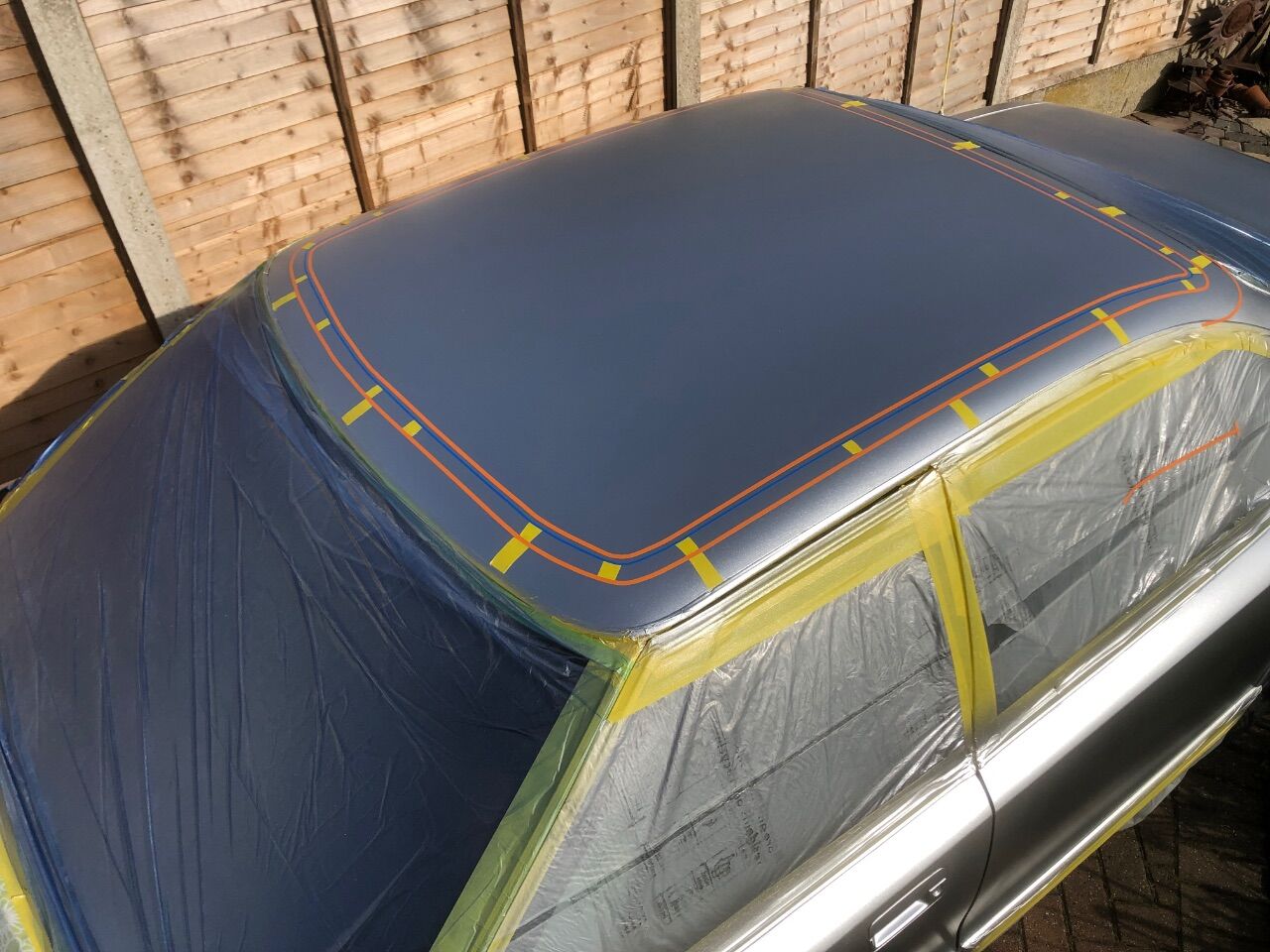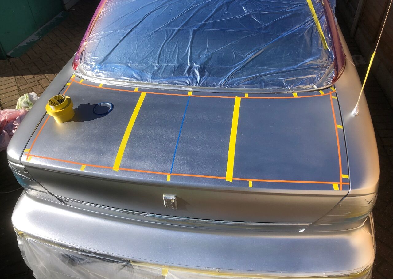 grizz Posted March 24 Author Posted March 24 Β So the lace curtainβ¦..?? Β I donβt think most people have a real clue what preparation is needed.Β Β My initial plan was to create two panels longitudinally over the roof.Β With a colour band down the centre, the same as was going around the roof edge above the non-existent rain gutters and window rubber.Β Β Painting needs to be done in reverse, whatever goes on first is exposed last etc.Β You need to measure in, lay pin stripes and then mask out the parts that donβt get painted.Β Once all the masking is done, you lay the lace over and cut to size, followed by anchoring it down, because the air pressure will lift it and screw up the pattern when you paint.Β Β While inspecting that initial lay out for two panels, I realised it had a scalloped end, which would look much better as a single edge, than split up. So despite being marked out, I aborted it. Sticking to a single panel.Β Β This was a great decision for me to make, despite my plans as the results speak for themselves.Β Β Once cut to shape and tacked down, I chose two colours that I wanted to use.Β Β Many people use black, with a background, but my dominant colour would be blues.Β Β Hopefully the photodump tells the rest of the story.Β Β Β I also followed up with the C-Pillars.Β Β More about this later.Β Β Β .Β Β Β SilverMachine, 666jjp, auntiemaryscanary and 5 others 6 2