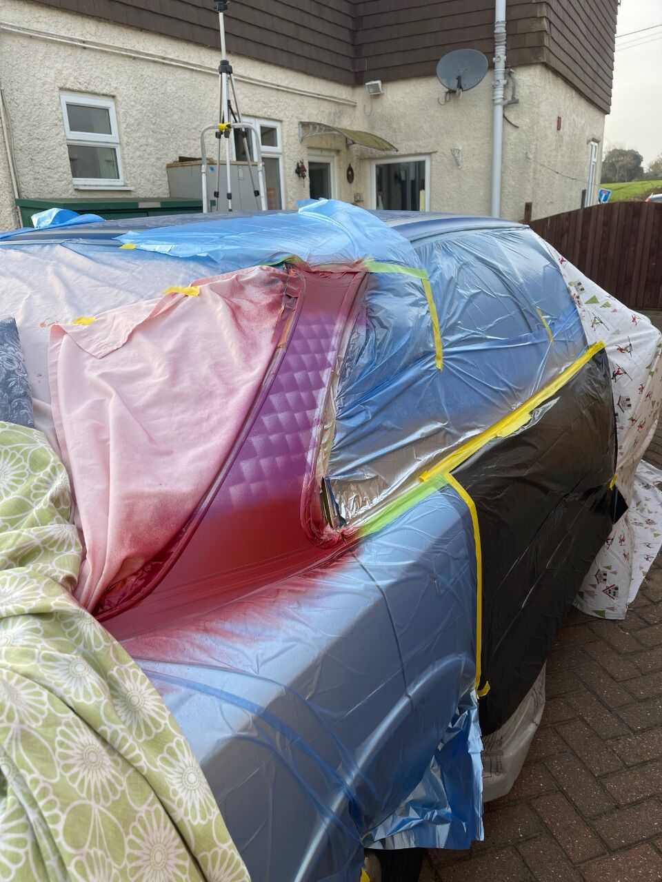 grizz Posted March 22 Author Posted March 22 Thursday morning 10.50 AM is when the paint hit the test card.Β Getting the gun set up is not a dark art, but it isβ¦.. Getting Air, Paint, Fan to all happen at the right ratio is about settings and also a bit of common sense. None of which I happen to have in the right ratio.Β Β So I muddled along and started to paint the car that had been stood in the sun, warming up.Β Β My ambient temperature thermometer only showed 13βC on the front doorframe of the garage, in the shade, with a breeze constantly moving air.Β Β But I was not going to waitβ¦β¦. Β Nooooooβ¦β¦. Mr Impatient. Β Β So I painted and painted.Β Β Nearly 2 liters of paint used.Β Β A total of three coats of silver.Β Β Not perfect, but a great result.Β Β Typicallyβ¦β¦β¦. Β A crisis presented itself too.Β Β Look carefully at the fender damageΒ Β Yupβ¦.. Loose overall smudged it REPEATEDLY.Β Β But after exhausting my swear diary and filling the swear jar with many coinsβ¦β¦ Β You can see the fender repair worked.Β Β Eventually finished the painting and cleaned my tools.Β Β Remember the way I had masked the drivers door so it could be opened and the car driven up to the house??Β Β I removed the pillow cases draped in the engine bay, and drive up to the house to give the car almost 4 hours in the sun.Β Β By 5.00pm I draped some old duvet covers over it and used a breathable caravan cover Mickey had discarded 3 years ago, to cover it ovrrnight.Β Β Friday weather was forecast to be warm enough to allow it to dry some more.Β Β Of course a restless night later, I cautiously looked under the covers on the hood at 08.00 and that paint had not reactedβ¦β¦β¦ pheww !!! Β By 10.00am the heavy fog had lifted and I uncovered the car.Β Β Inspected all surfaces and found that at that point, none of the paint had reactedβ¦β¦.., Thank goodness.Β Β Β You will see how the colour actually changes in different angles and intensity of light.Β Β So now we have a car that the top half is silver.Β Β Β Back to the paint shop tomorrow morning to get something blue.Β Β No idea what tone or colour it would be.Β Β Β Yet.Β Β Β Β . Dick Cheeseburger, eddyramrod, Tenmil Socket and 5 others 8