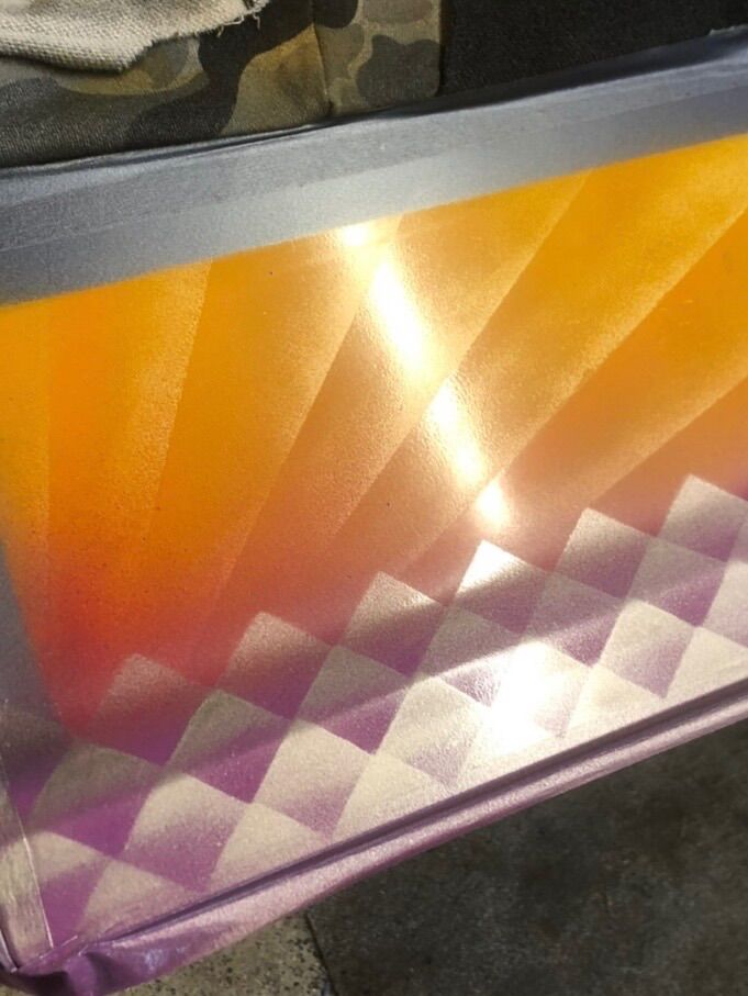 grizz Posted March 27 Author Posted March 27 Masking all done on the boot/trunk lid, it was time to figure out what designs and colours to use.Β Β I like contrast in both colours and textures.Β Β So I created some stencils that have been seen already.Β Β Thereβs a few recurring themes that you see in Lowrider art that I have always loved.Β Β Fish scales, (I have now of course also created Dragon scales)Β Sunrise fades Never ending lines Lace paint obviouslyΒ Geometric shapes repeatingΒ Multiple coloursΒ Β So that brings us to actual pattern and painting.Β Β I started with a four colour panoramic sunrise. Usually they are done as a fan shape of the likes of large C-Pillars.Β Β Masking up the other panels, I kept moving the masking around so that I could paint one panel at a time, without overspray on the rest of the car or panels.Β Β Fish scales next.Β Β Weirdly, they were a challenge too.Β Β You will see the length of the stencil, which means holding it down in a way the paint lands where you want it, rather than blowing under or over.Β Happy with that result, including the accentuating of the pinstripes around the panels.Β Β My next one was possibly the hardest to choose and commit to. Halloween style spider webs. Also getting them to look the same meant a bit of searching for a duplicate.Β Β Colour matching the lace on the roof.Β Β So far, so good.Β Β Β I will do a second part to this lot for the last piece, which I know was the most difficult and complex part of the job.Β Β Β Back in a bit.Β Β Β . 666jjp, FakeConcern and MrBig 3
